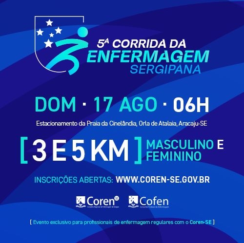 | R$ 0,00 | 5KM (EVENTO EXCLUISIVO PARA PROFISSIONAIS DA ENFERMAGEM REGULARES COM O COREN-SE) |